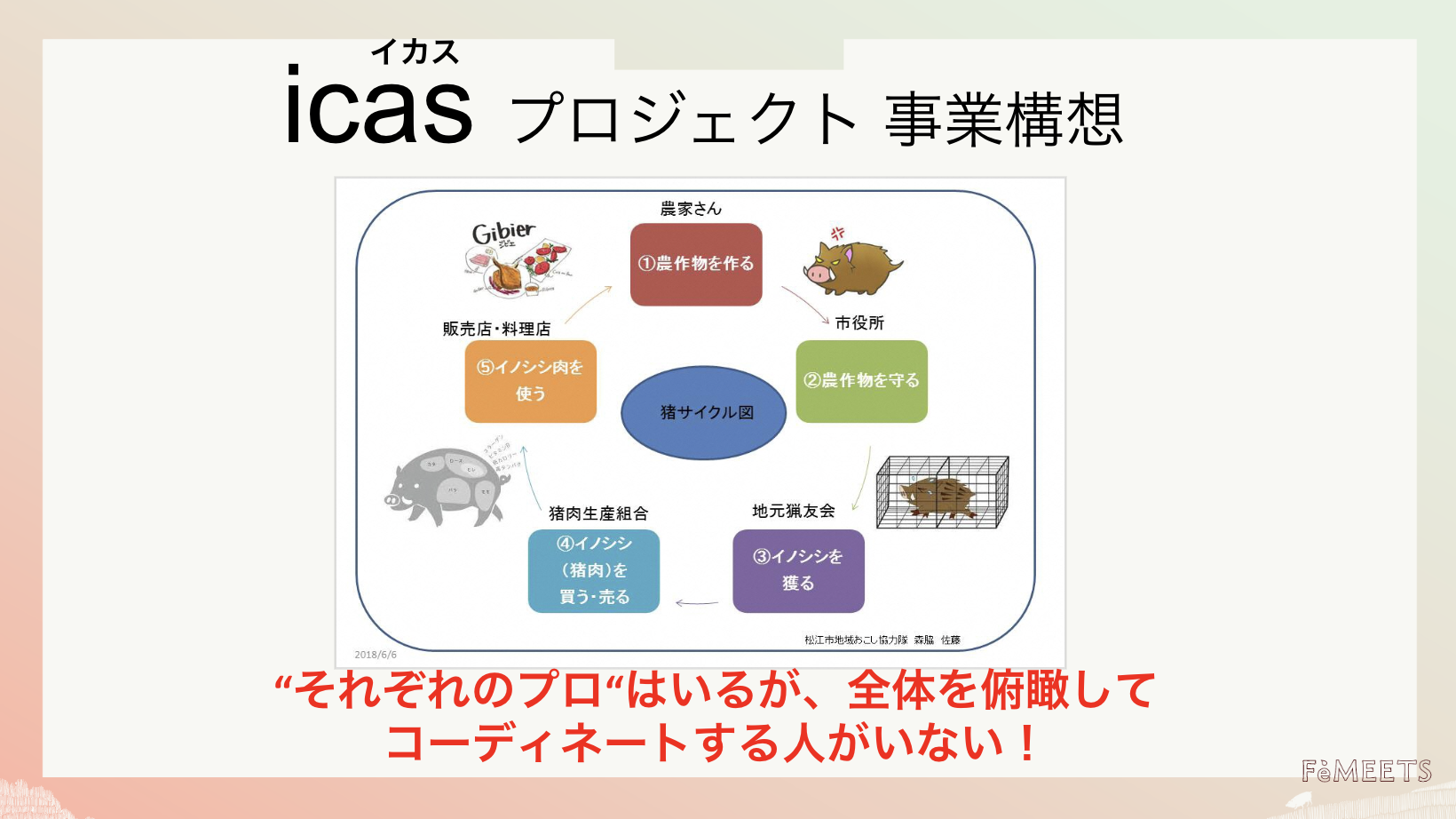 「icasプロジェクト」では、農家・市役所・猟友会・肉生産組合・飲食店をつなぎ、地域全体でイノシシ資源を活かす仕組みを展開。さらに栄養士の視点を生かし、貧血傾向の女性を対象にジビエレシピを開発しています。「イノシシを幸せにしたい」という思いを軸に、人と動物の共生を模索しています。