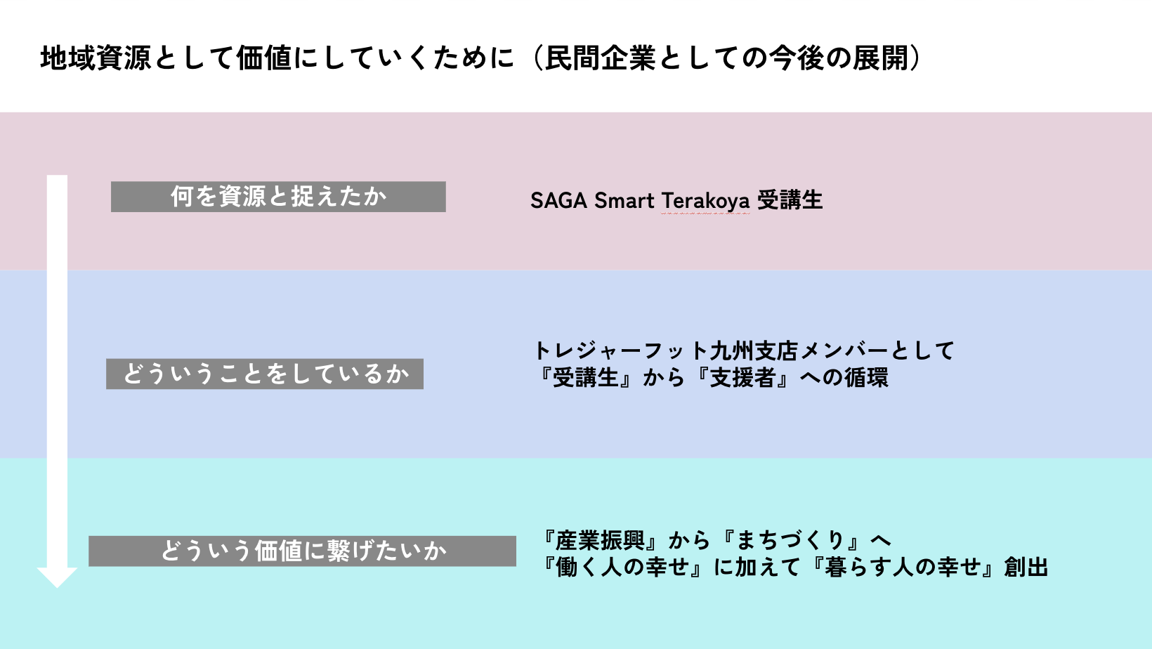 佐賀県の外郭団体から受託した「RYO-FU BASE」では、DXやスタートアップ支援に加え、年間200名規模のプログラミング・AI人材を育成。得られたスキルを県内企業に循環させ、起業や複業につなげています。「人材」という資源を循環させることで、地域にお金とスキルを回すモデルを築いています。