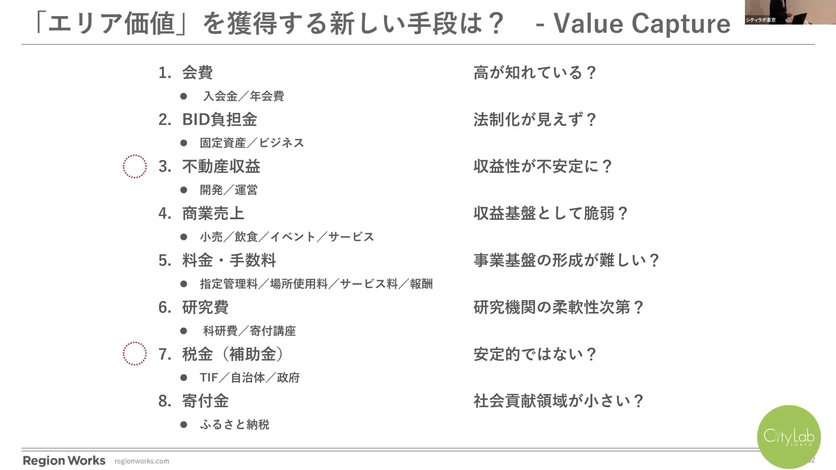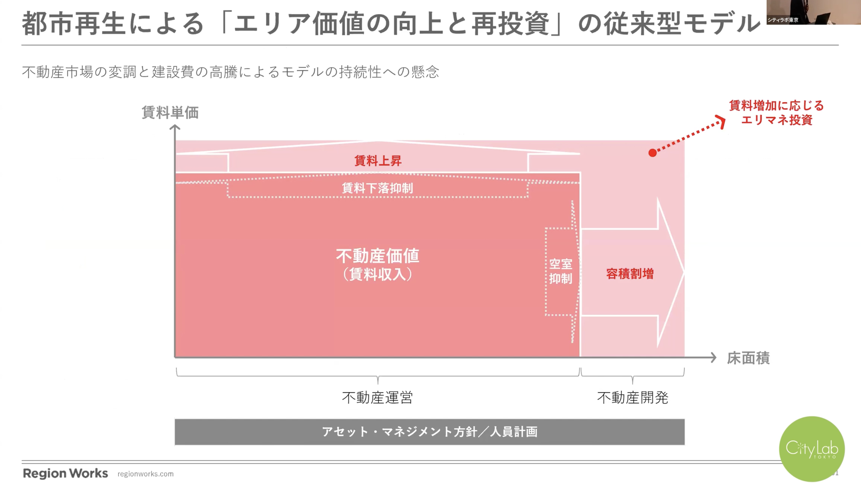 後藤さんは、“生産に貢献するまちづくりが大事”だと考えています。経済は、「生産・分配・支出」の三面等価の原則が基本ですが、人口も減少している中では、特に生産の部分をまちづくりでも強化し、生産性を左右する“付加価値の向上“を捉え、都市と産業の結合をイメージできるか否かがポイントです。これまでは大規模再開発により不動産価格が上がり、その売上げの一部を不動産会社等を通じてエリアマネジメントに回すというモデルが主流でしたが、建設費の高騰や社会情勢の影響もあり難しくなってきました。本書では触れられていませんが、「これからは、エリアの価値の媒体を不動産と税金以外も含めて複合的に思考していかないといけない」と後藤さんは感じています。みんな何かしらのお金を回して生きており、それぞれの日常のまちの営みとお金の流れをどう繋ぐかを考える事が必要です。