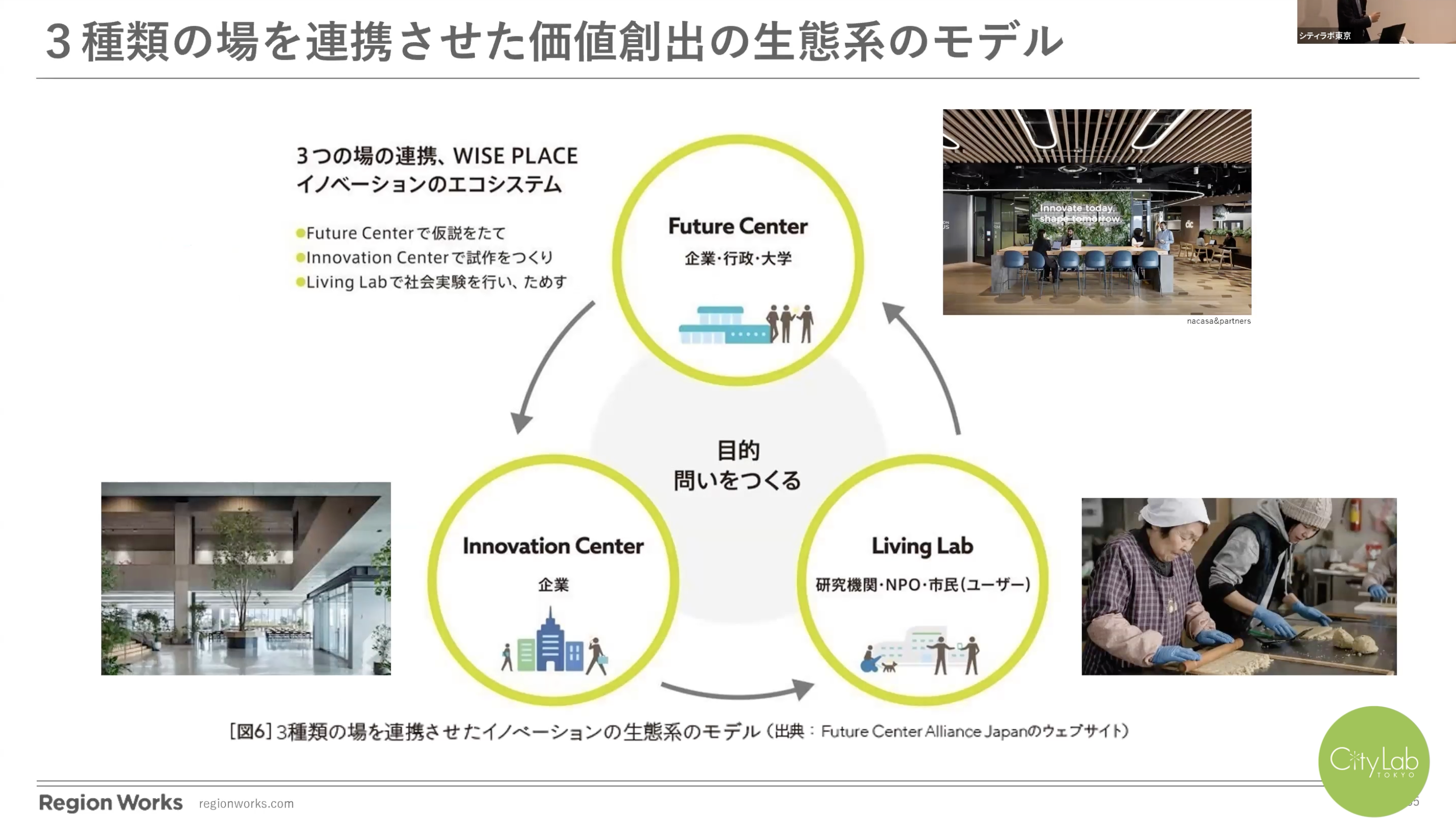 エリマネについて、国土交通省では「地域における良好な環境や地域の価値を維持・向上させるための、住民・事業主・地権者等による主体的な取り組み」と定義されていますが、少々分かりにくさも感じます。エリマネという言葉は海外では通じない日本独自の考え方で、海外で使われているエリマネに一番近い言葉としては「Place Management」があります。本書内でも「場の経営」という言葉が出てきますが、「共有された文脈、関係性のある、人々が生活する舞台(場)」において、「経営資源を効率的に活用し、経営上の効果を最適化する(経営)」という考え方が重要です。エリマネの継続には“人材・お金・空間”の3要素の配分を考え、戦略的にプログラムされた活動と経営が必要だと後藤さんは考えています。また、一般社団法人Future Center Alliance Japanが提唱している「フューチャーセンター(仮説を立てる場)」「イノベーションセンター(プロトタイプを試す場)」「リビングラボ(社会実験を行う場)」の3つの場のうち、自分がどの場づくりに取り組んでいるのかをしっかり意識することが重要だそうで、後藤さんもまた、これまでの活動の中で様々な「場」に関わってきました。