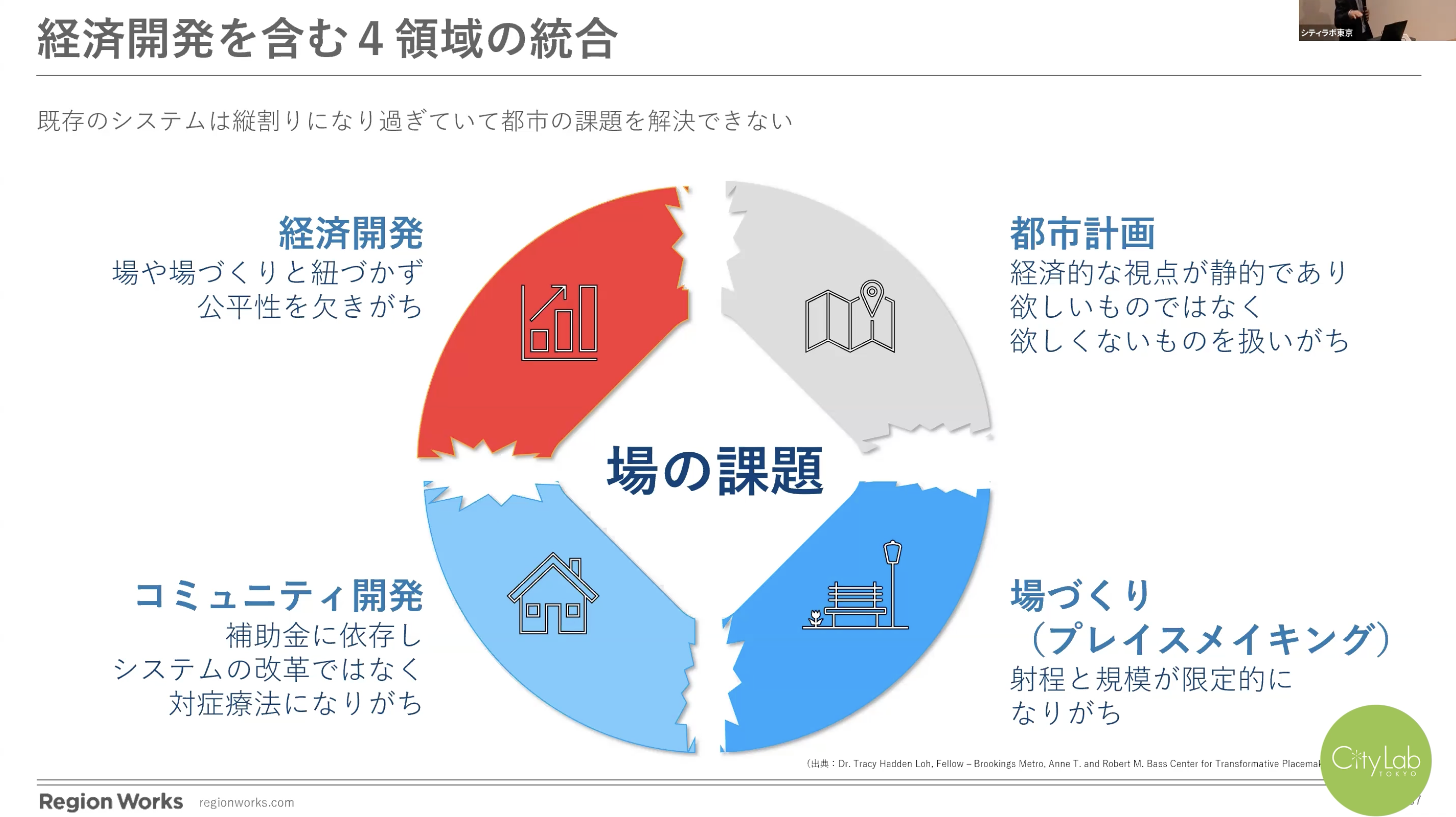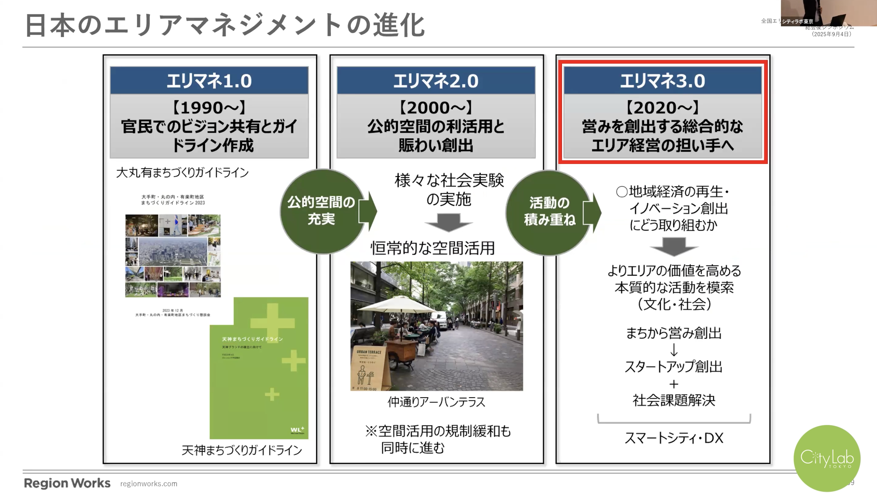 アメリカのブルッキングス研究所では、都市の衰退を逆転させるために「経済開発・都市計画・コミュニティ開発・プレイスメイキング」の4つの領域の取組みを「場」によって結合させることが必要と指摘しています。後藤さんは、この4領域をアメーバーのように動き回れることがエリマネにとって重要だと考えます。そのためには、建築学科出身の人々ばかりではなく、多様なバックグラウンドを持った人が集って取り組むことが求められます。日本のエリマネも、これまでの公共空間活用が主軸となっていた状況から、総合的なエリア経営の担い手として機能するよう考え方をシフトチェンジしつつあるようです。国土交通省の「都市の個性の確立と質や価値の向上に関する懇談会」における中間取りまとめでも、公共空間の利活用に留まらない、「共創・支援型エリアマネジメントによる地域経営」というビジョンが示されました。