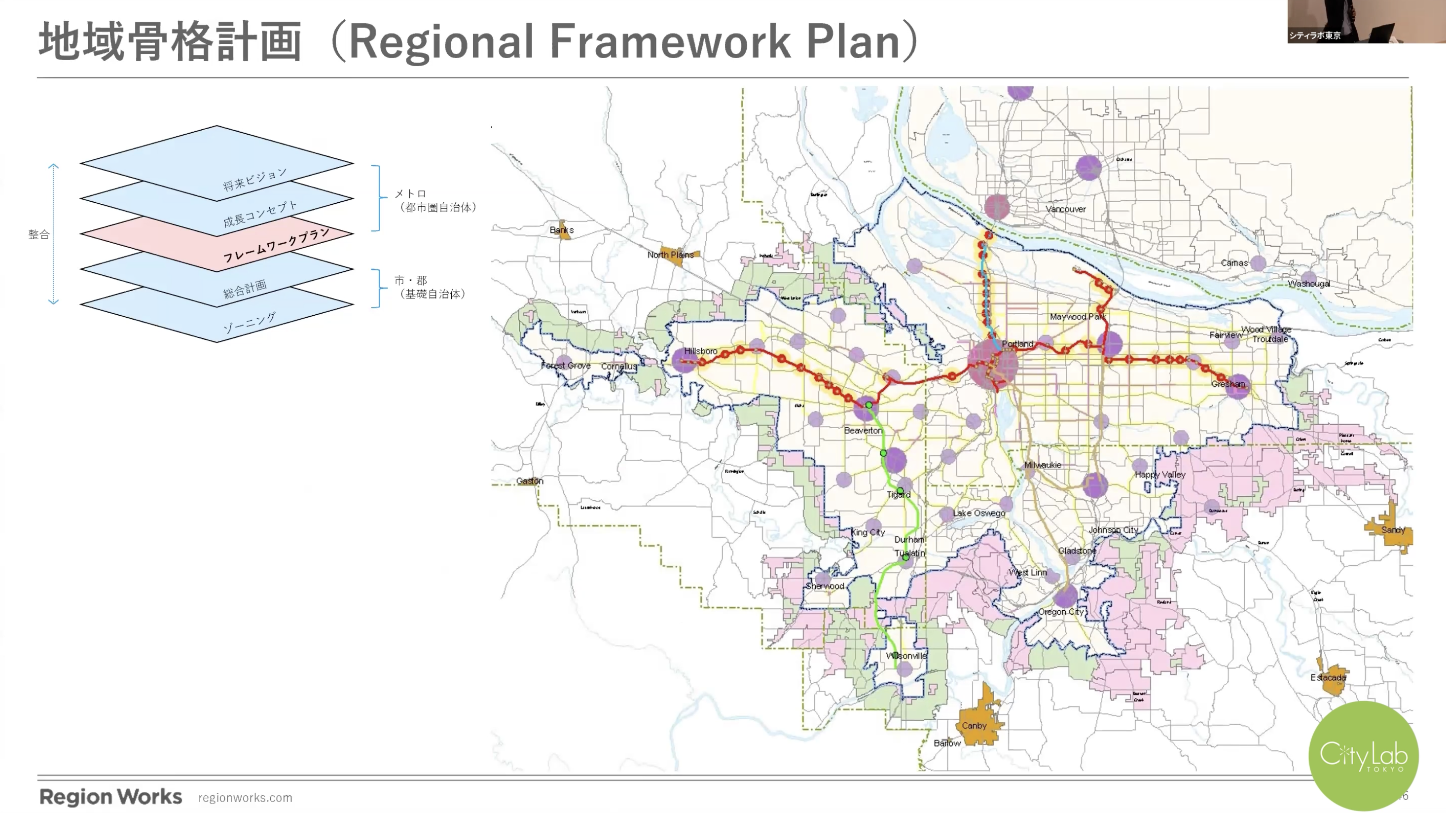 “戦略を諦めていない”ことが結構珍しいのだと、後藤さんは感じるようになりました。団体立ち上げ・社会実験・プロジェクトメイクなどが各地で取り組まれていますが、本当の意味で行政と「差し」で会話しながら政策に位置付けるということは意外と見過ごされているのかもしれません。後藤さんが戦略を大事にしている背景として、ポートランド都市圏自治体「メトロ」に勤めていた際「地域骨格計画」を作った経験があります。緩いビジョン(上)と地方自治体レベルでの総合計画や地区計画等(下)の間に骨格計画(フレームワークプラン)があり、「上と下に変更があっても真ん中がしっかりしていれば何とかなる」という状況を成り立たせる仕事に後藤さんは従事していました。この可変式計画の作成と運用というもののノウハウを本書内にも残したとのことです。