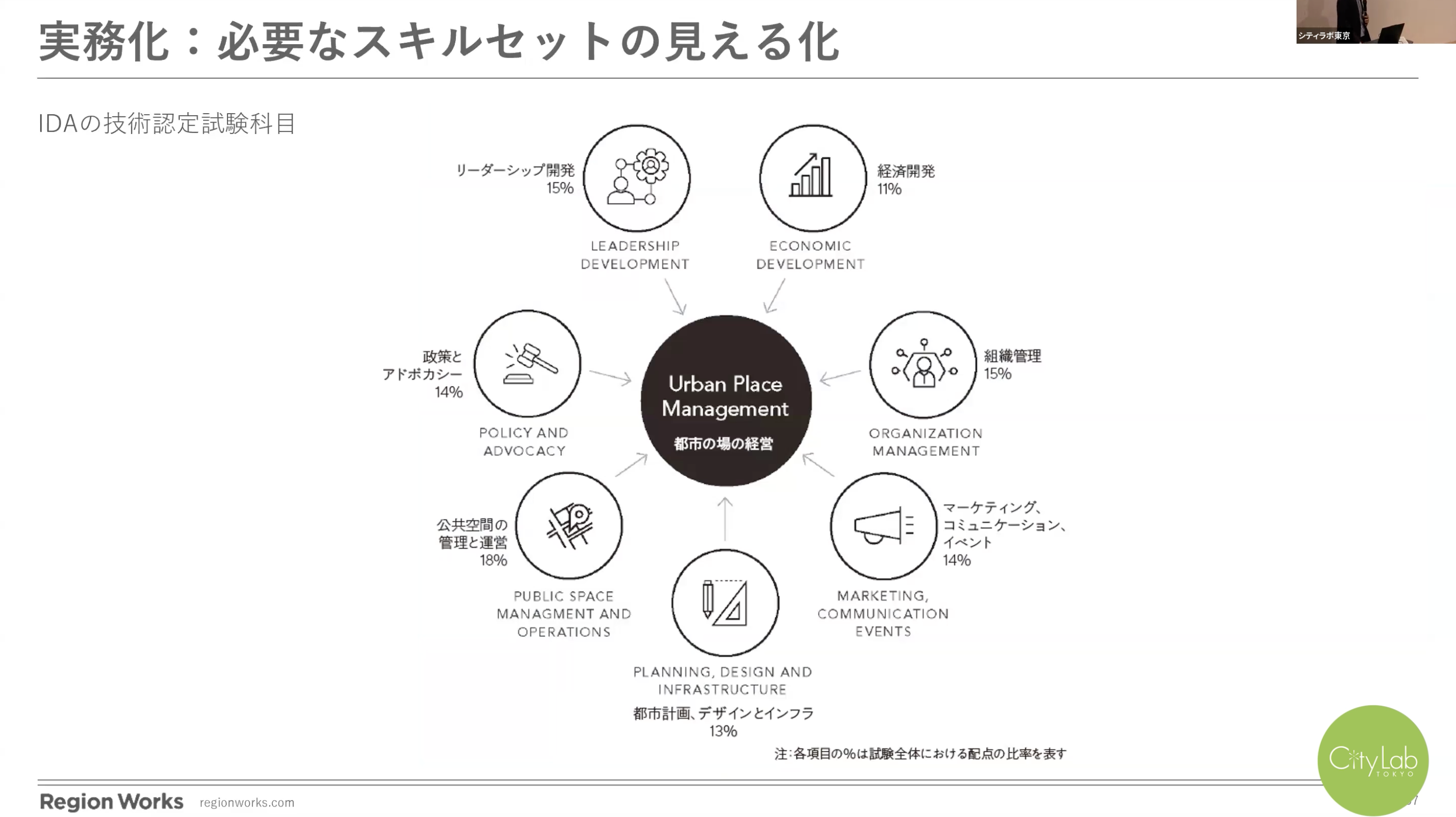 - 理論化:エリマネに理論がないことが致命的である。 アメリカのIDA(International Downtown Association)では、非常に多くのリサーチを重ねたうえで各地の取組みを支援していますが、それに比べて日本ではリサーチが少なすぎるようです。