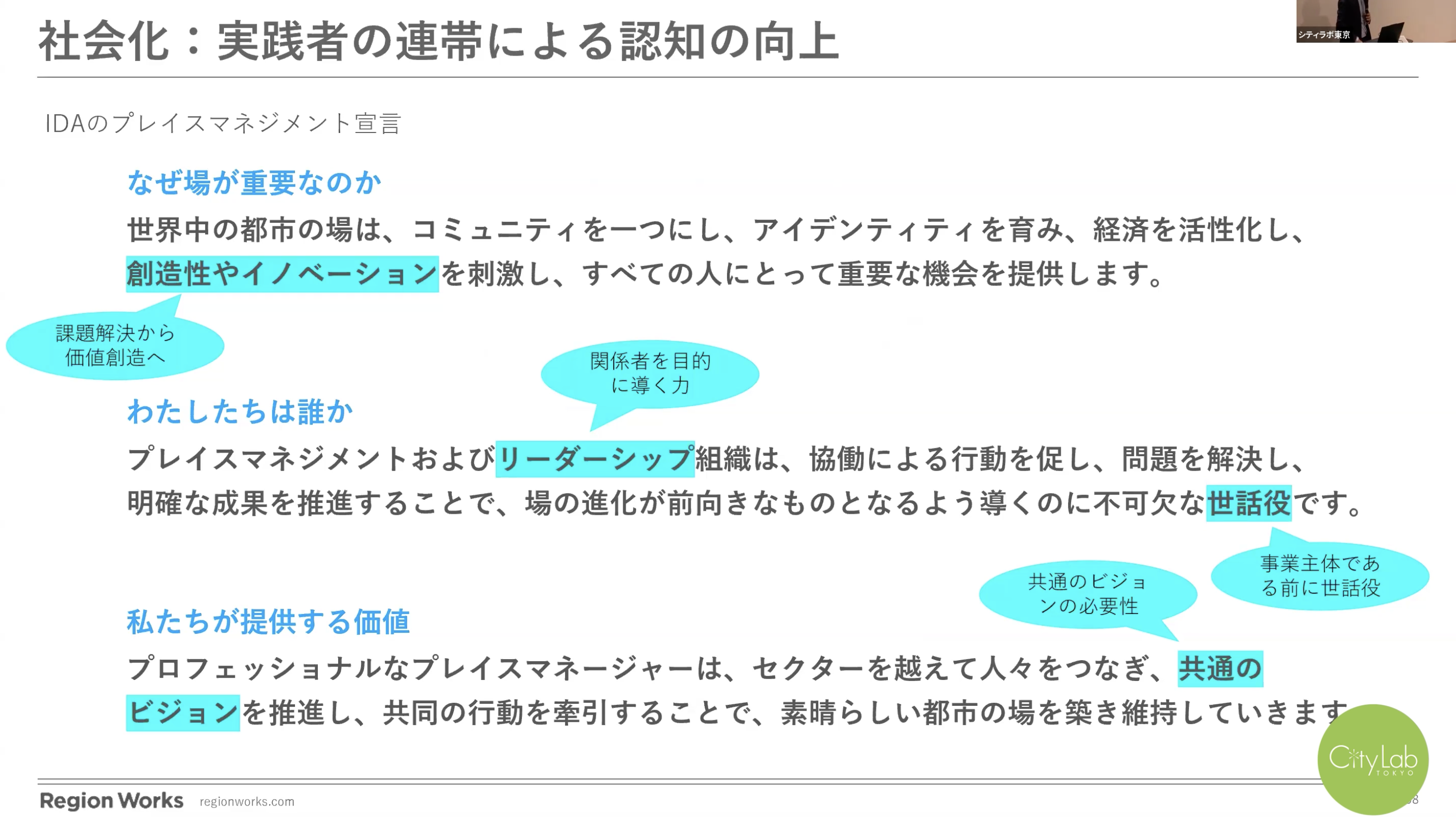 - 社会化:エリマネという概念の一般への認知が不足している。 この問題は(言葉はプレイスマネジメントですが)アメリカでも問題となっており、IDAから出された「プレイスマネジメント宣言」では、概念の重要性、組織の役割、提供する価値が示されました。