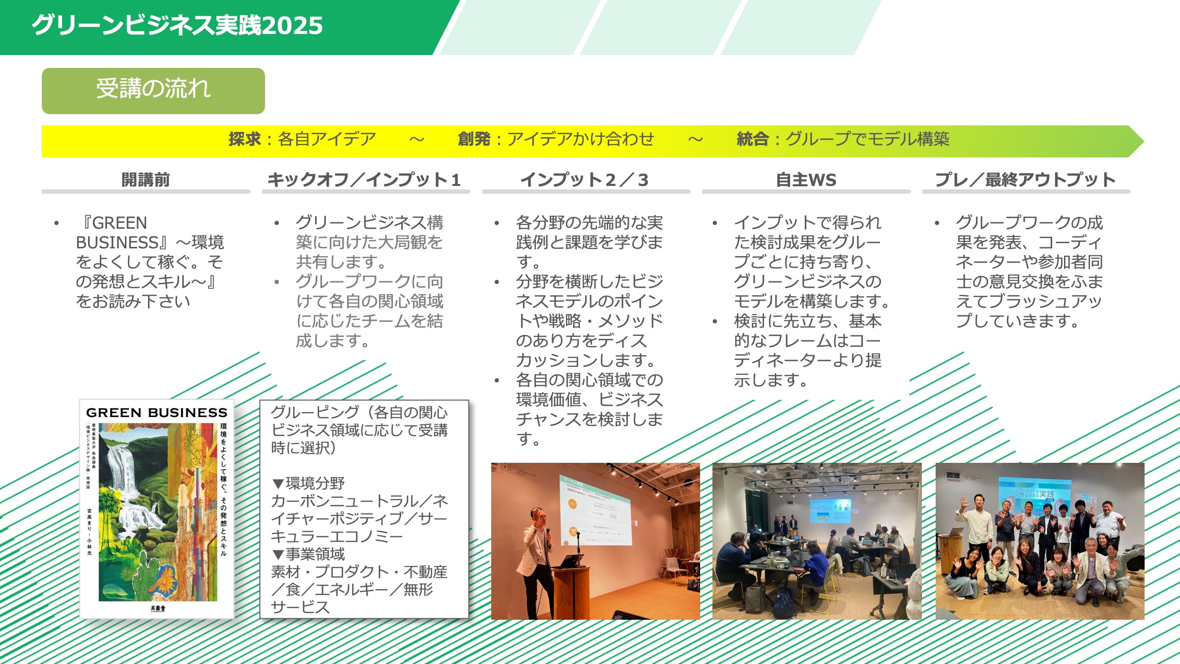 本プログラムが生まれたそもそものきっかけは、2021年発刊の『GREEN BUSINESS: 環境をよくして稼ぐ。その発想とスキル。』に遡ります。慶應大学や東京大学で実践型の演習授業として10年以上も継続してきた講座の経験の上に取りまとめられたこの書籍、これをベースに社会人が受講することでより効果の高いプログラムが生まれるのではないか…ということで、著者の小林光氏・吉高まり氏と共に立ち上げられました。