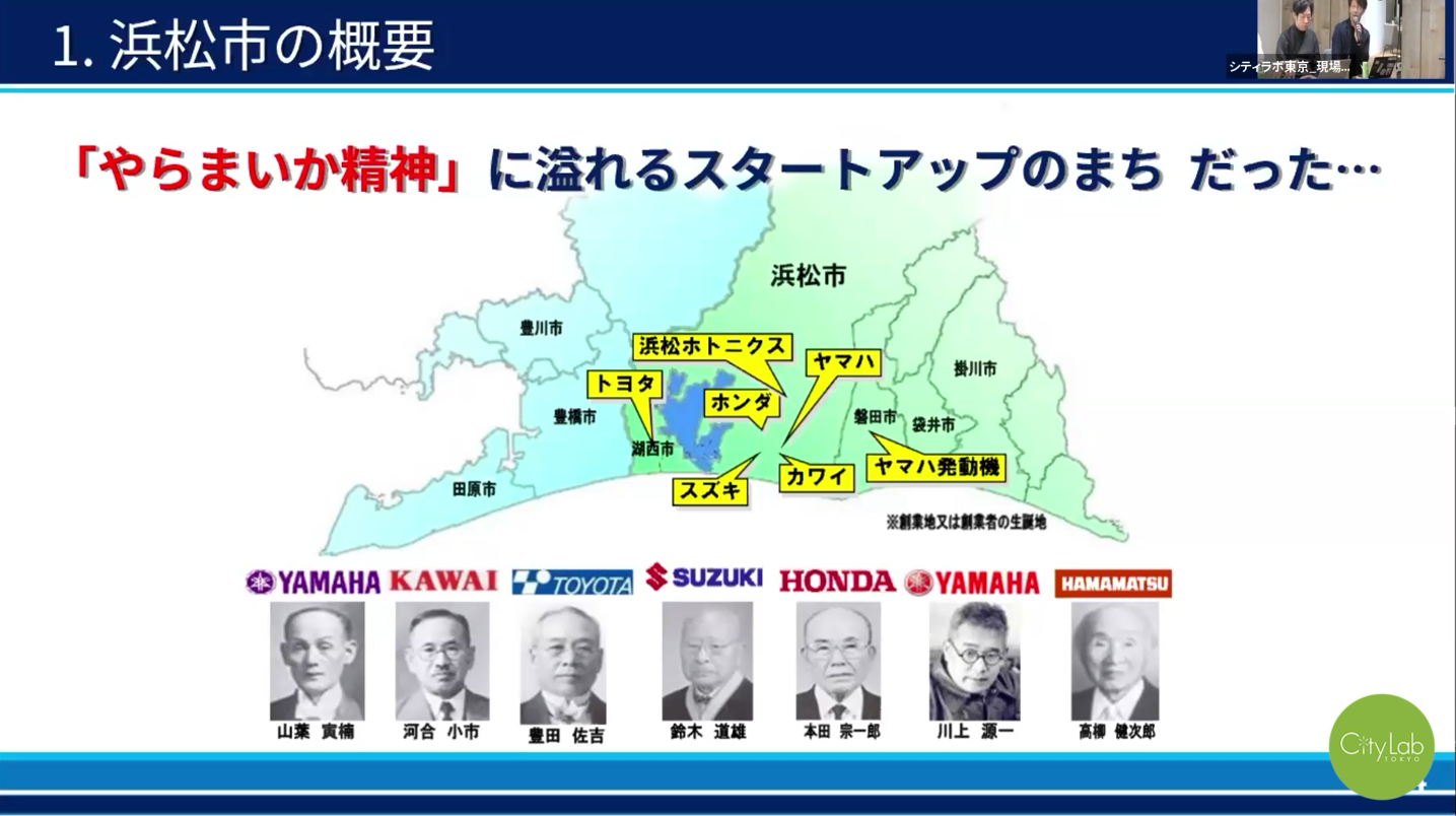 浜松市の総面積は全国の市区町村で2番目に広く、縦長の市域に山・川・湖・海とあらゆる自然があります。新幹線で東京まで90分、名古屋市まで30分とアクセス良好で、寛容な風土・市民性があるのも特徴です。「やらまいか精神(方言でやってみよう、やってやろうじゃないかを意味する)」が息づいており、世界でも活躍する名だたる企業が発祥・現在も工場等の拠点を置いています。特に機械類の部品を製造する企業が多く、ものづくりのまちでもあります。浜松市における大きな課題はやはり人口減少で、その対策として「まち・ひと・しごとの一体的・総合的な創生」を市のミッションとして掲げています。