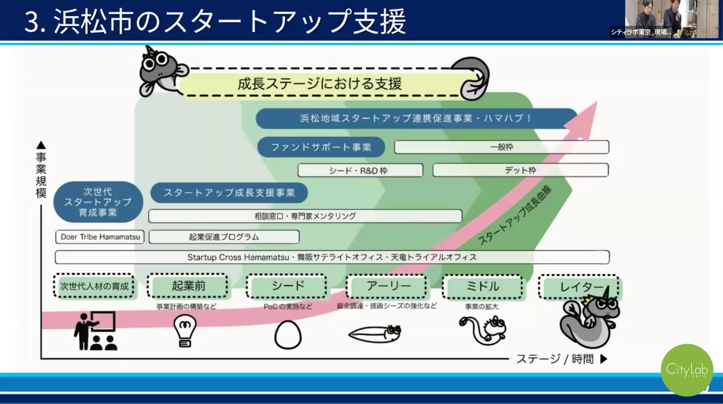 浜松市では、起業前からレイターに至るまで、あらゆるフェーズでのスタートアップ支援メニューを提供しています。中でも「浜松地域スタートアップ連携促進事業」にて運営しているマッチングプラットフォーム「ハマハブ!」には、地域企業が抱える課題や庁内各部署の課題が掲載されており、課題解決に対応できる企業とのマッチングを促進しています。ハマハブ!には、①スタートアップに知見が深い事務局によるサポート、②円滑なマッチングの実施、③マッチング後の支援、の3つのポイントがあり、マッチング後には補助金の交付や伴走支援も行っています。うなぎのイラストは「うなコーン」という名前で、名産のウナギとユニコーンを掛け合わせた、スタートアップ支援におけるイメージキャラクターです。
