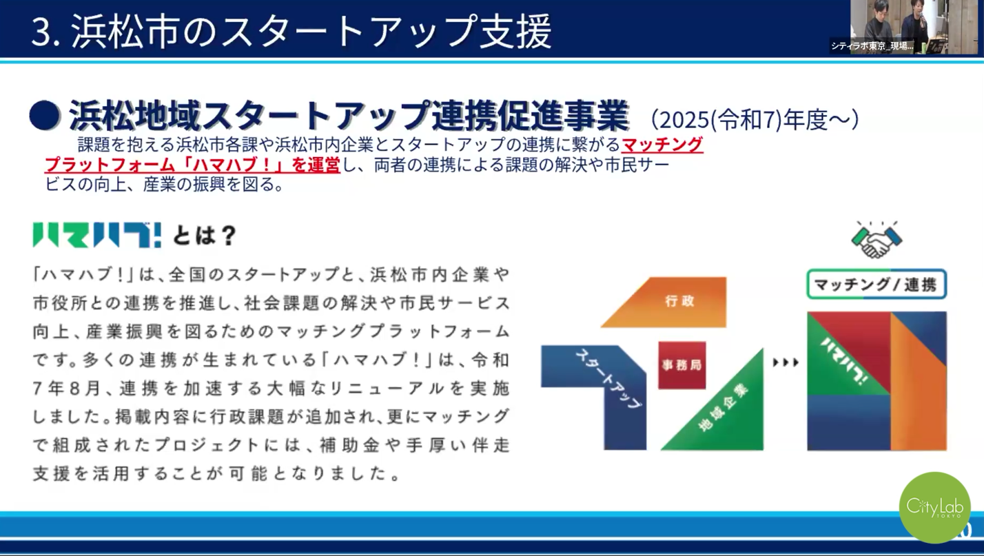 2025年12月3日、シティラボ東京のパブリックパートナーにフォーカスした企画の第二弾である「Public Partners Pitch2(以下、PPP2)」を開催し、現地・オンライン合わせて31名が参加しました。今回のテーマは、「スタートアップ支援充実型の自治体トーク!」として、宇都宮町、京都市、浜松市の3自治体が講演、後半はシティラボ東京(以下、CLT)の会員でもあるMISO SOUPの北川さんがファシリテーターとして加わりディスカッションを行いました。