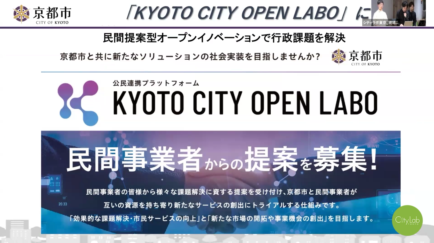 現在京都市が一番課題と捉えているのは人口減少です。2023年から人口戦略アクションとして105の対策を具体化しましたが、行政だけではなかなか大きな成果が得られていません。このような課題解決に民間企業と一体となって取り組むため、「KYOTO CITY OPEN LABO」という公民連携プラットフォームを2021年に立上げ、開設から現在までに約340件の提案を受け、110件以上の連携が成立しました。京都市が抱える行政課題を開示し、民間企業は解決策をプラットフォーム上で提案することができるシステムになっており、ここに載っていない課題について、企業側が持つ技術・ノウハウ・アイデアを提案できるコーナーも設けられています。