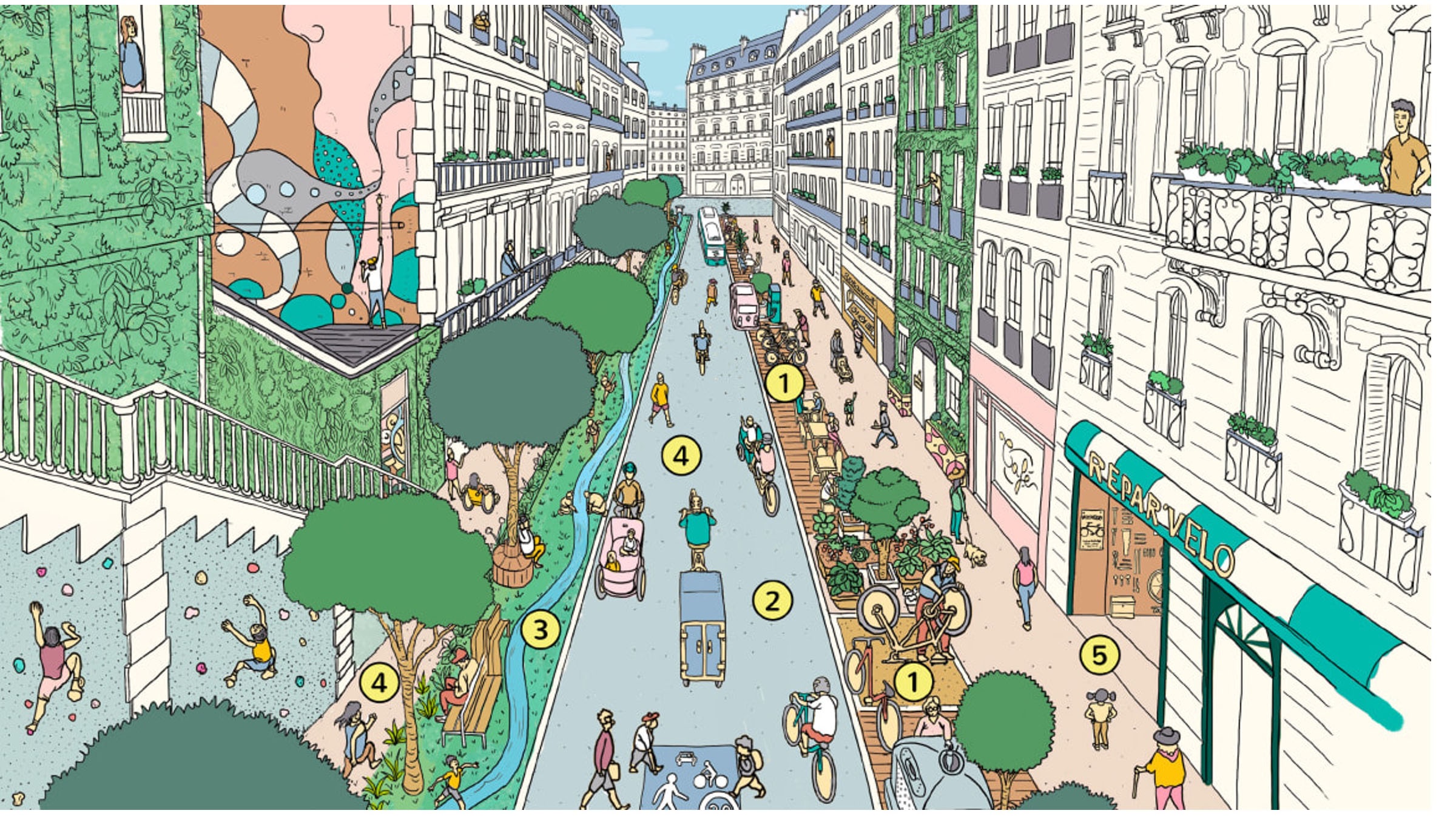 なお、X-minute Cityは都市機能の配置に注目が集まりがちですが、実は、緑化や木質化など自然も重視しています。バルセロナのスーバーブロックでも大街区内の道をウォーカブルにすると共に緑化を加速させており、最近はEixos Verds(緑の軸)と名前も変わっているとのことです。