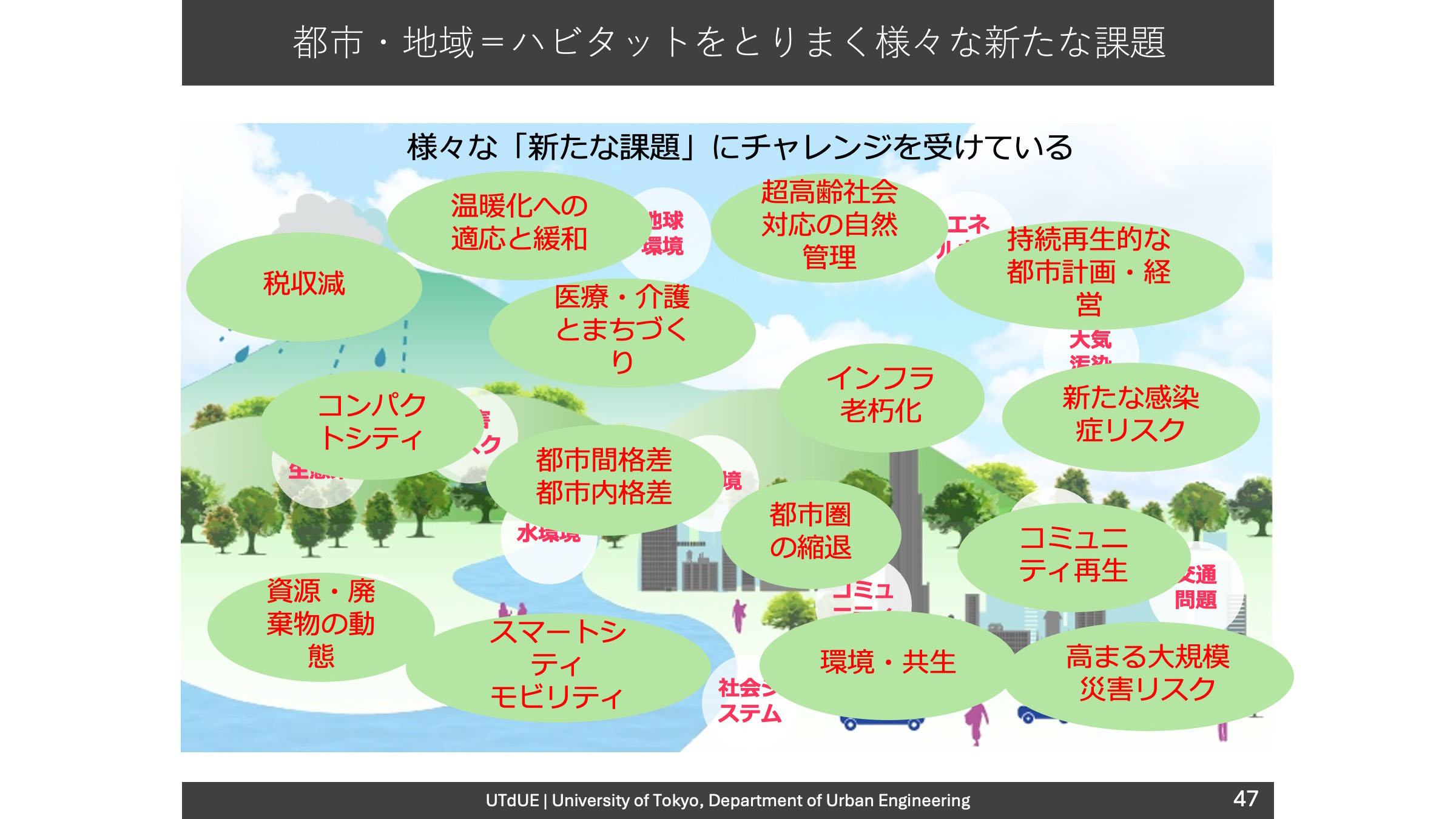 もう一つは、「多くの分野」で考えることです。情報技術の発展やグローバル化する経済、気候変動や生物多様性の問題など、従来の都市や地域が成立する前提を覆すかような大転換が起きている中、人間の空間だけに限らない暮らしの要素、自然、安全、文化、制度、技術といった視点も含めた一体で、複合化する都市問題への対応や価値観の転換を考える必要があります。