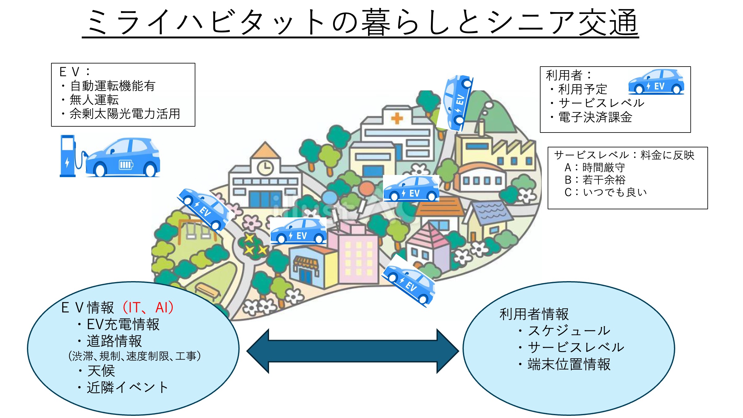 一つは、「ミライ・ハビタットの暮らしとシニア交通」です。現在でも自動運転や利用者とのマッチングといった技術は存在しているのですが、なかなか実現していません。15-minute cityのようなコンパクトに都市機能が集積している近隣であれば、乗りたい時に乗れる、コスパが良い、社会コストも小さくしたい…といった社会的ニーズを満たせる可能性も高まるとのことです。