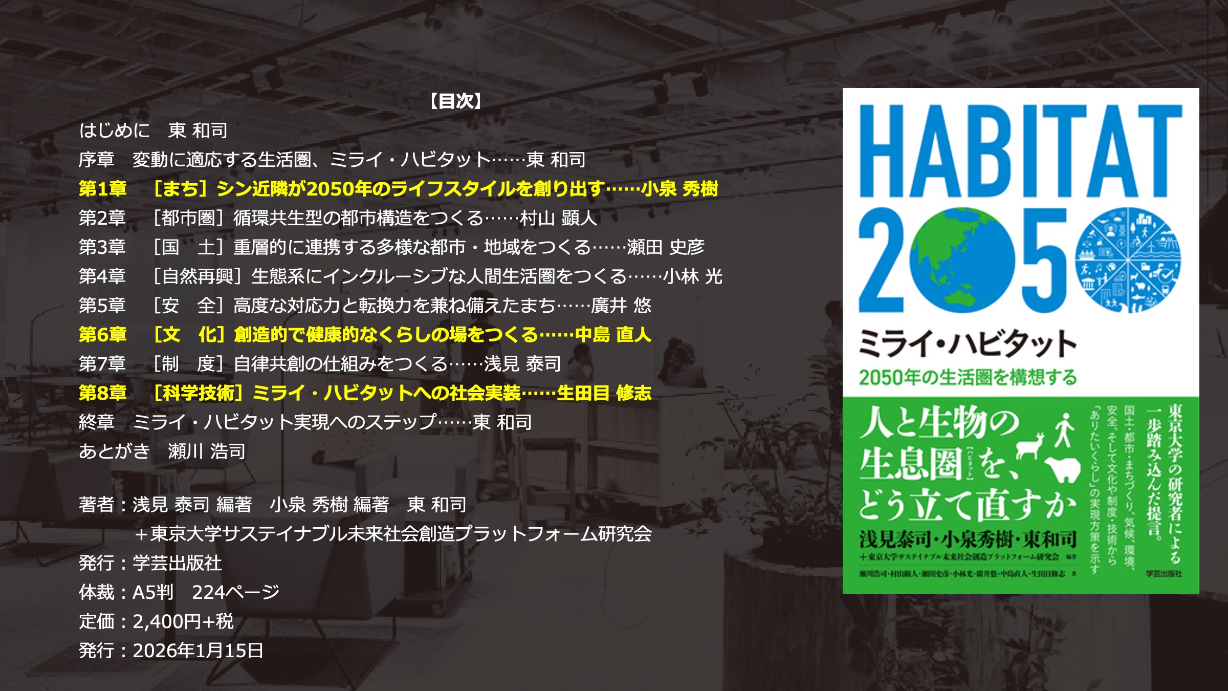 2026年2月4日、学芸出版社との共催により、「『ミライ・ハビタット』出版記念セミナー〜「シン近隣」から2050年のライフスタイルを構想する」を開催、合計で67名(現地40名、オンライン27名)が参加する盛会となりました。