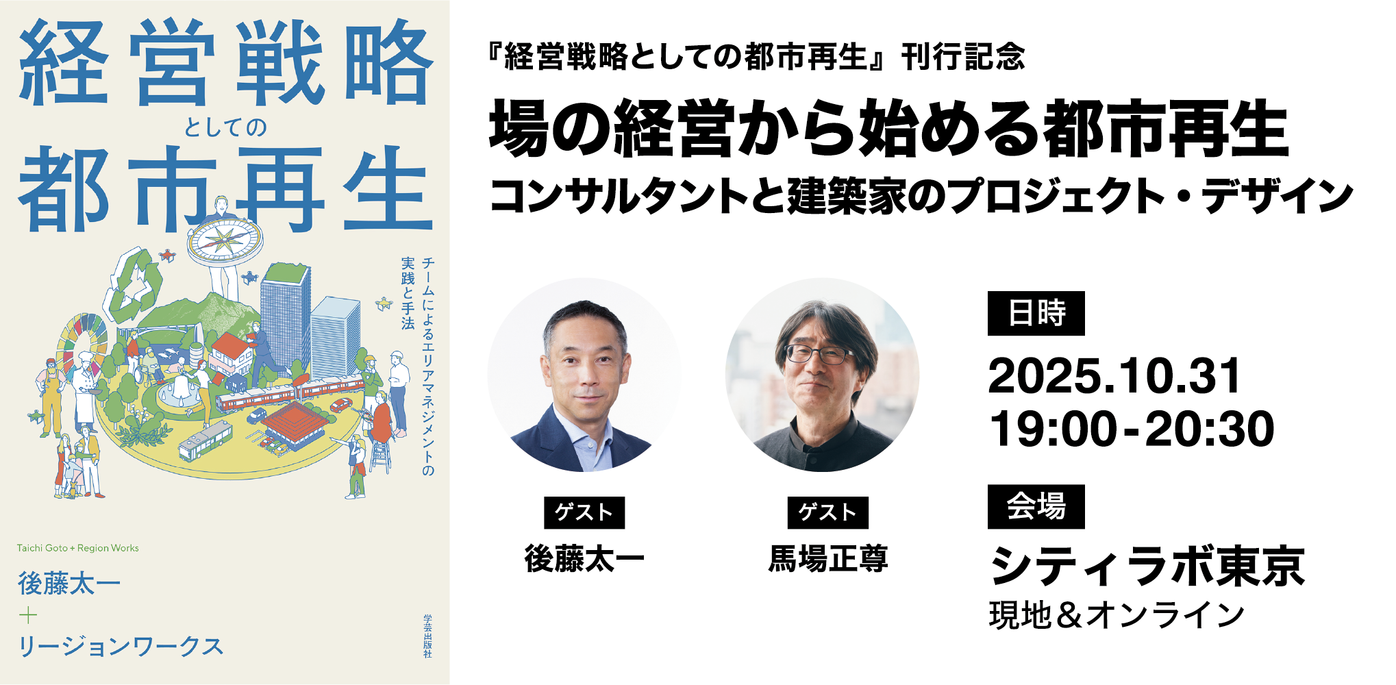 『経営戦略としての都市再生~チームによるエリアマネジメントの実践と手法』の刊行を記念して、著者の後藤太一さん、ゲストに建築家の馬場正尊さんをお迎えし、トークイベントを開催します。